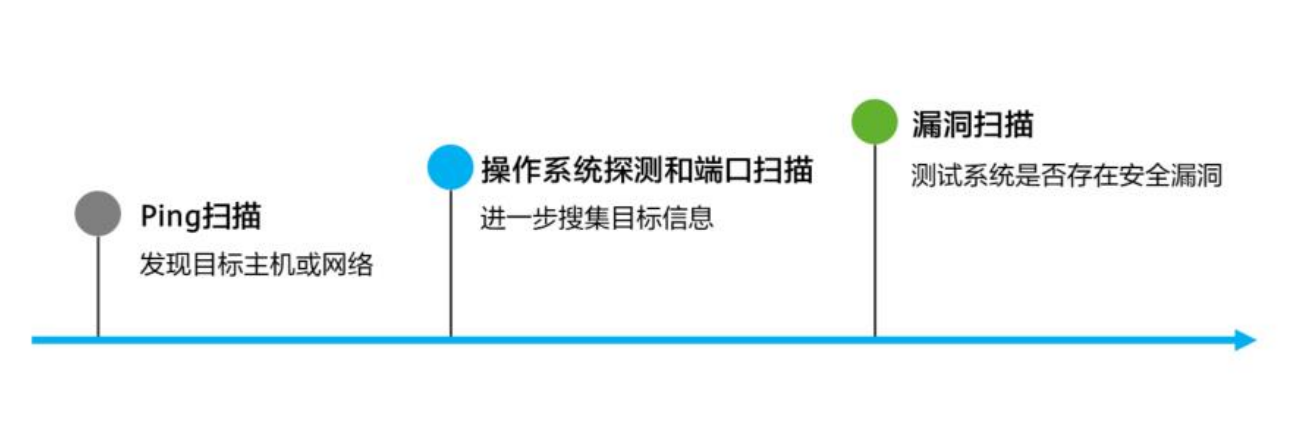 漏洞扫描过程:Ping扫描确定目标主机地址,端口扫面确定目标主机开放的端口,然后基于端口扫面的结果,进行操作系统检测,最后根据掌握的信息进行漏洞扫描。